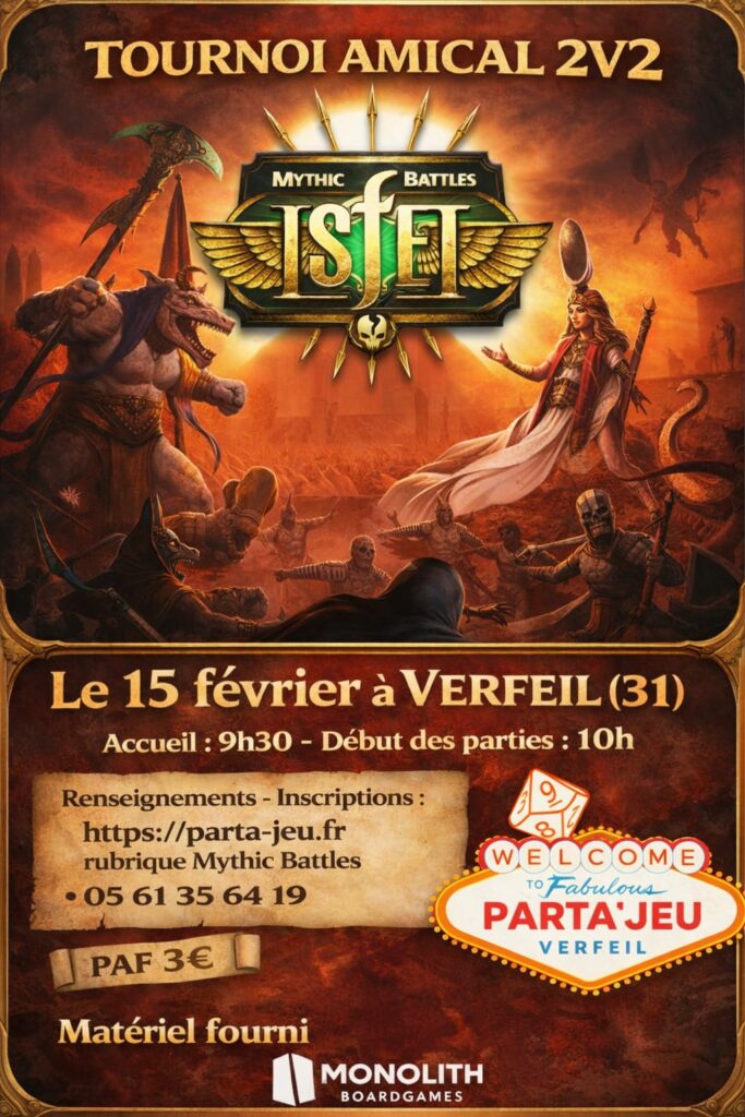 L’association “Parta’jeu” organise un tournoi amical de Mythic Battles Isfet en 2 vs 2 avec draft au début de chaque manche dans un pool. Le tournoi se déroulera lors de la journée jeu, du 15 février 2026 qui se tiendra dans la Halle aux grains à VERFEIL 31590.